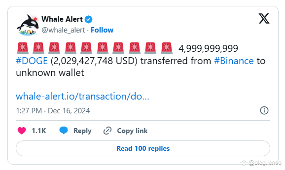 Dogecoin ($DOGE) chứng kiến hoạt động thị trường gia tăng sau khi có người chuyển một lượng lớn DOGE — 4,99 tỷ coin (trị giá khoảng 2,03 tỷ đô la) — từ Binance sang một ví không xác định.