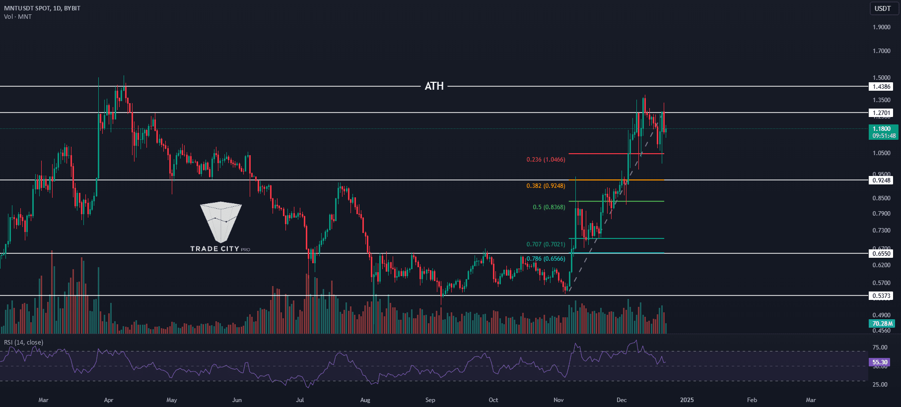 📊 Mặc dù có sự điều chỉnh đang diễn ra, khối lượng bán đã giảm, và các nến xanh thể hiện khối lượng cao hơn, cho thấy sức mạnh của xu hướng tăng giá MNT.