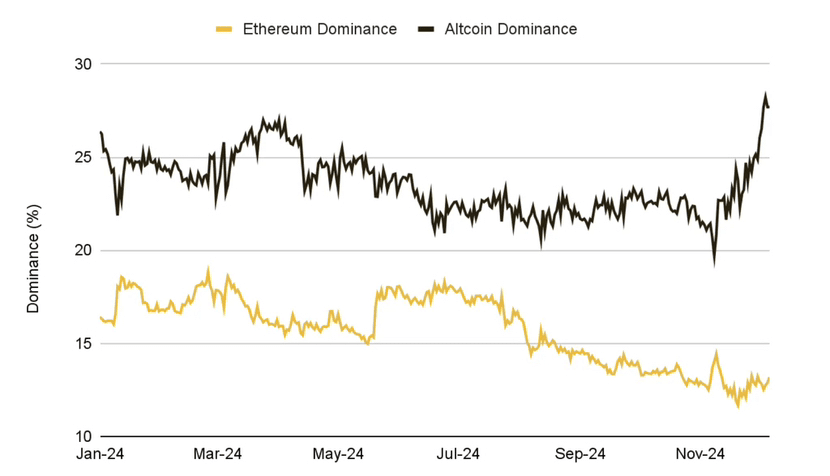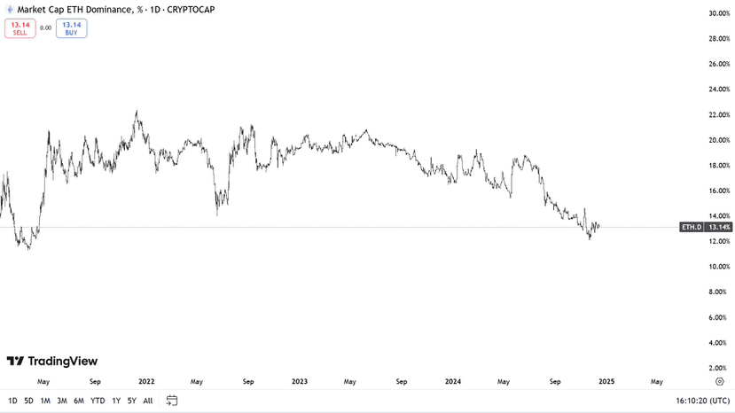 Mặc dù giá cao, sự thống trị của Ethereum hiện đang dao động quanh mức 13% — một mức mà chúng ta chưa thấy kể từ năm 2021.