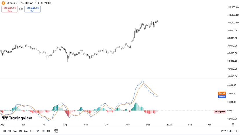 Hiện tại, biểu đồ cho thấy đường màu xanh lam giảm xuống dưới đường màu cam, báo hiệu động lực tiêu cực.