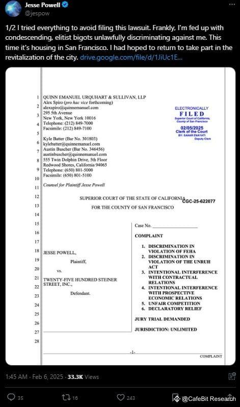 Vụ kiện nộp ngày 5/2 cho rằng hội đồng quản trị tòa nhà 2500 Steiner Street từ chối giao dịch mà không có lý do rõ ràng. Khiếu nại cáo buộc Powell phải đối mặt với sự phân biệt đối xử do nhà của ông bị FBI khám xét vào đầu năm 2023.