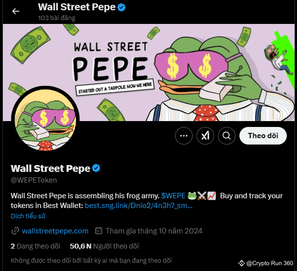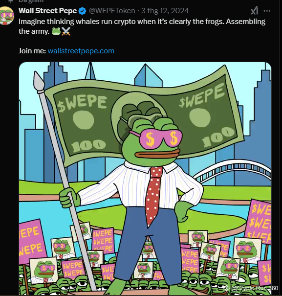 $WEPE được lấy cảm hứng từ meme nổi tiếng "Pepe the Frog" và được thiết kế để "chế giễu" các nhà đầu tư truyền thống . Tuy nhiên, điều này không ngăn được sự quan tâm của cộng đồng tiền điện tử . Trên thực tế, $WEPE đã thu hút được một lượng lớn người theo dõi và sự hỗ trợ từ các nhà đầu tư nổi tiếng.