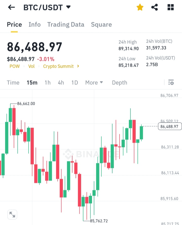 Bitcoin ($BTC /USDT) đang thể hiện sự biến động mạnh, hiện đang giao dịch ở mức $86,488.97, giảm -3.01% trong 24 giờ qua. Giá đã đạt mức cao nhất trong 24h là $89,314.90 và mức thấp nhất là $85,218.47, cho thấy một phạm vi giao dịch rộng. $BTC Biểu đồ phản ánh sự phục hồi từ $85,762.72, với động lực tăng giá hình thành các mức thấp hơn. Các nhà giao dịch nên chú ý đến mức kháng cự $86,500—một sự bứt phá có thể báo hiệu một đợt tăng giá khác về phía $89K. Về phía giảm, hỗ trợ quanh mức $85,200-$85,700 có thể là một vùng tái gia nhập vững chắc. Khối lượng giao dịch vẫn cao, cho thấy sự tham gia mạnh mẽ. Hãy cảnh giác với việc xác nhận xu hướng trước khi thực hiện giao dịch! $BTC