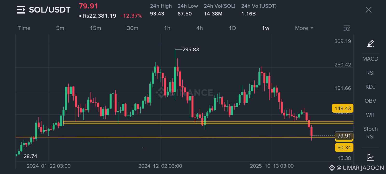 · Volume: Extremely high at 14.38M SOL ($1.16B USDT) - indicates panic selling