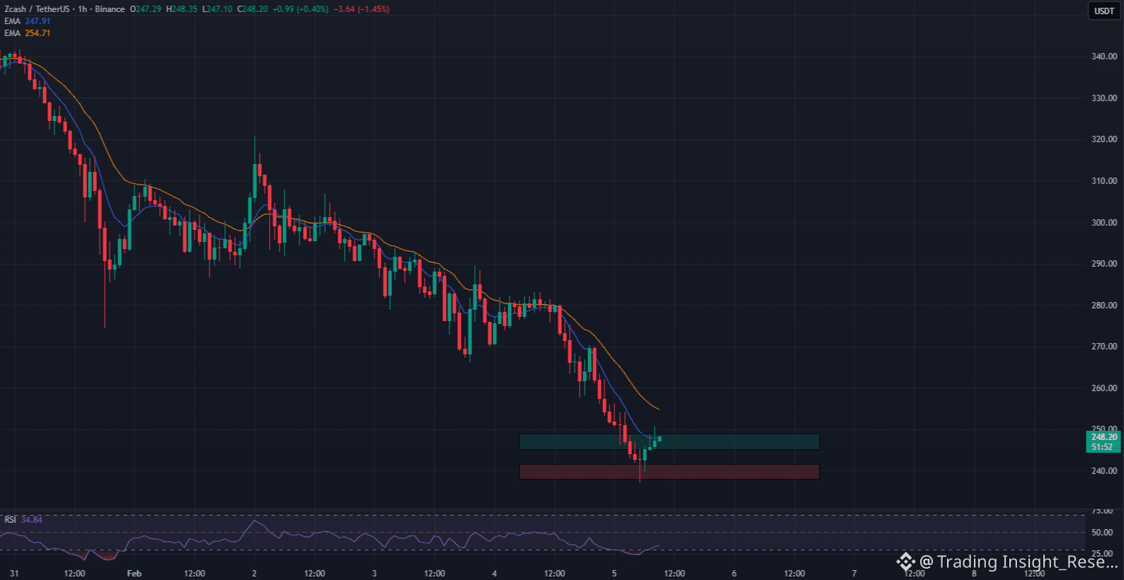 ZEC đã đóng nến Hammer với râu dưới dài, từ chối mức giá dưới $240. Điều này cho thấy người mua đang nhảy vào hấp thụ đợt bán tháo.
