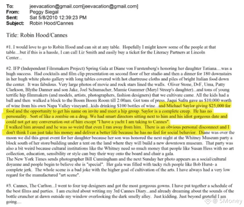 Siegal mô tả Saylor trong email rằng “gã này hoàn toàn là một kẻ kỳ quái, không có chút sức hút nào, giống như thây ma dùng thuốc quá liều. Bàn ông ta ngồi ngay cạnh những đạo diễn thông minh, nhưng ngoài câu ‘tôi có du thuyền’ và ‘tôi chuẩn bị đến Cannes’ thì không nặn ra được câu nào khác”. Bà ta không hiểu nổi làm cách nào để “lấy tiền từ tay người này.”