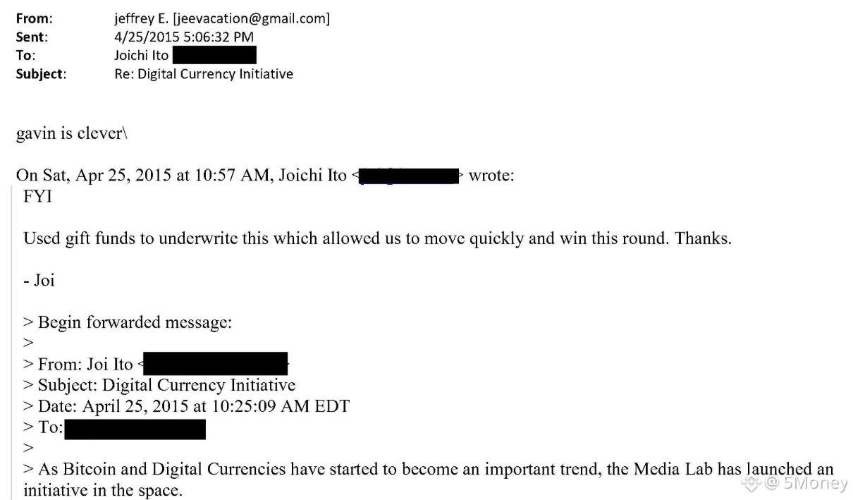Từ 2002 – 2017, Epstein đã quyên góp tổng cộng 850.000 USD cho MIT, trong đó 525.000 USD dành riêng cho MIT Media Lab, nơi trả lương cho các lập trình viên Bitcoin Core. Trong email cảm ơn Epstein, Ito viết rằng nhờ khoản tài trợ mà MIT “đã hành động nhanh chóng và giành được chiến thắng lớn” vì “rất nhiều tổ chức khác đang muốn thừa nước đục thả câu để kiểm soát các lập trình viên Bitcoin.”