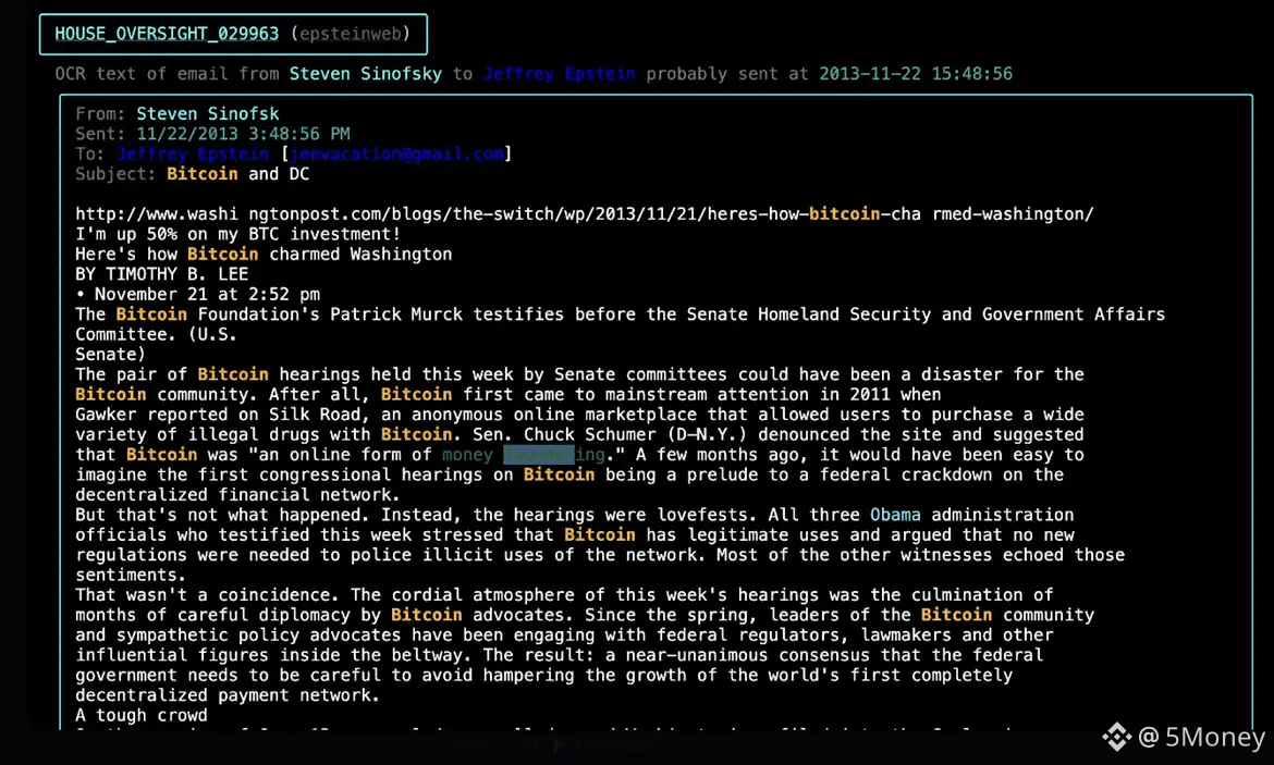Cùng thời điểm, Steven Sinofsky, cựu Tổng giám đốc mảng Windows tại Microsoft và hiện là đối tác tại quỹ a16z, khoe với Epstein rằng khoản đầu tư Bitcoin của mình đã tăng 50%. Sinofsky còn gửi cho Epstein một bài viết có tựa đề “Bitcoin đang mê hoặc Washington như thế nào.”