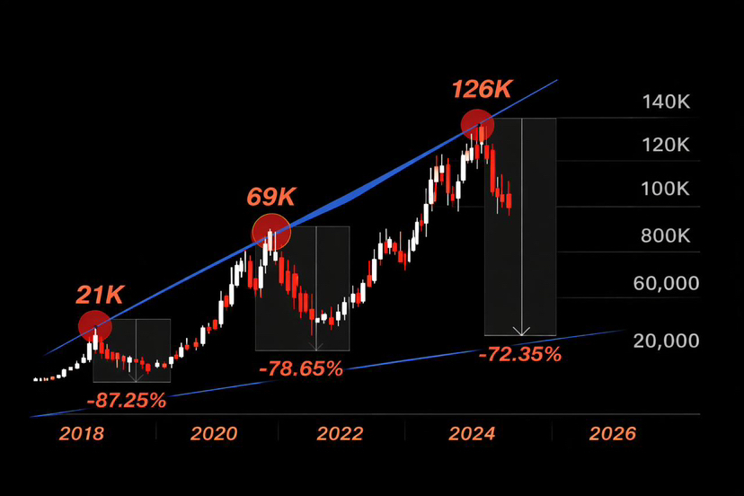 Chu kỳ hiện tại: đỉnh ~126K → kịch bản rủi ro -60% đến -75% là hoàn toàn có tiền lệ