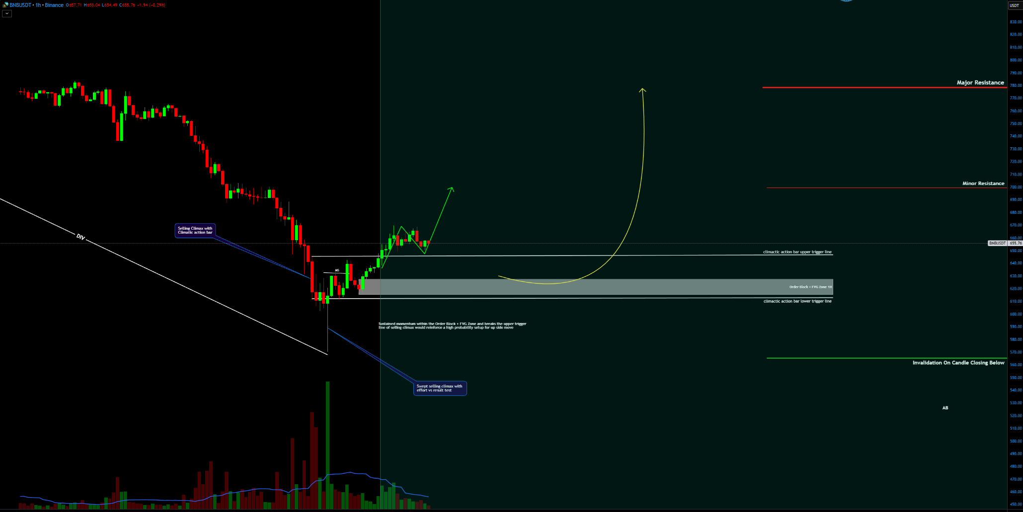 Bạn có đang theo dõi điều này đủ kỹ không? Bởi vì BNB đã hình thành một đỉnh bán theo sau là một nến hành động cao trào, và nếu bạn không chuẩn bị, bạn có thể bỏ lỡ một cơ hội lớn. Thêm vào đó, chúng ta thấy đỉnh bán đã bị quét bởi bài kiểm tra nỗ lực so với kết quả, một xác suất cổ điển cho thấy các nhà đầu tư tổ chức đang bước vào. Đây là nơi mọi thứ bắt đầu trở nên thú vị.