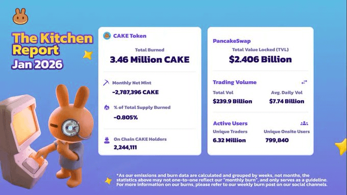 Vào tháng 1 năm 2026, PancakeSwap đã phát hành 674,316 CAKE qua các khuyến khích nông nghiệp, sử dụng sản phẩm và tăng trưởng hệ sinh thái. Trong cùng thời gian đó, 3,461,712 CAKE đã được đốt. Phần lớn trong số đó đến từ phí giao dịch swap và hợp đồng tương lai, với các đợt đốt bổ sung liên quan đến các tính năng dự đoán và các công cụ giao thức nhỏ hơn.