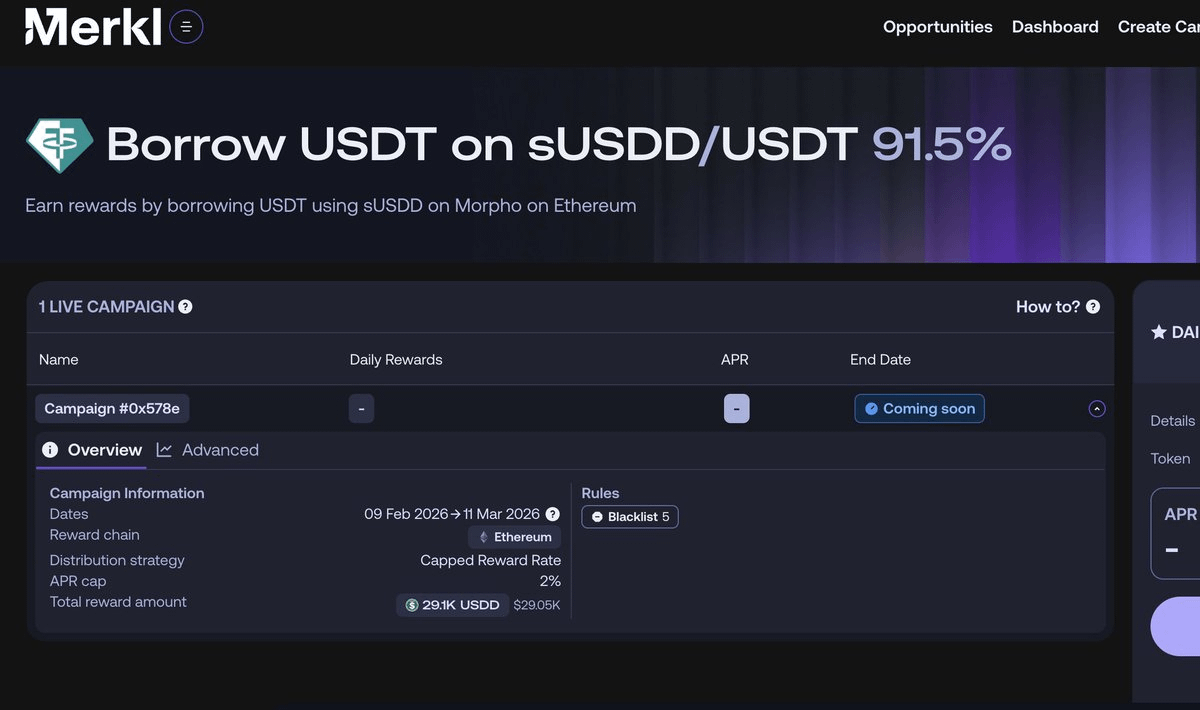 Một cơ hội mới đang mở ra cho những ai theo đuổi looping strategy và tối ưu hiệu quả vốn trong DeFi. Lần này, tâm điểm là thị trường sUSDD/USDT trên Morpho, với phần thưởng được phân phối trực tiếp thông qua Merkl.