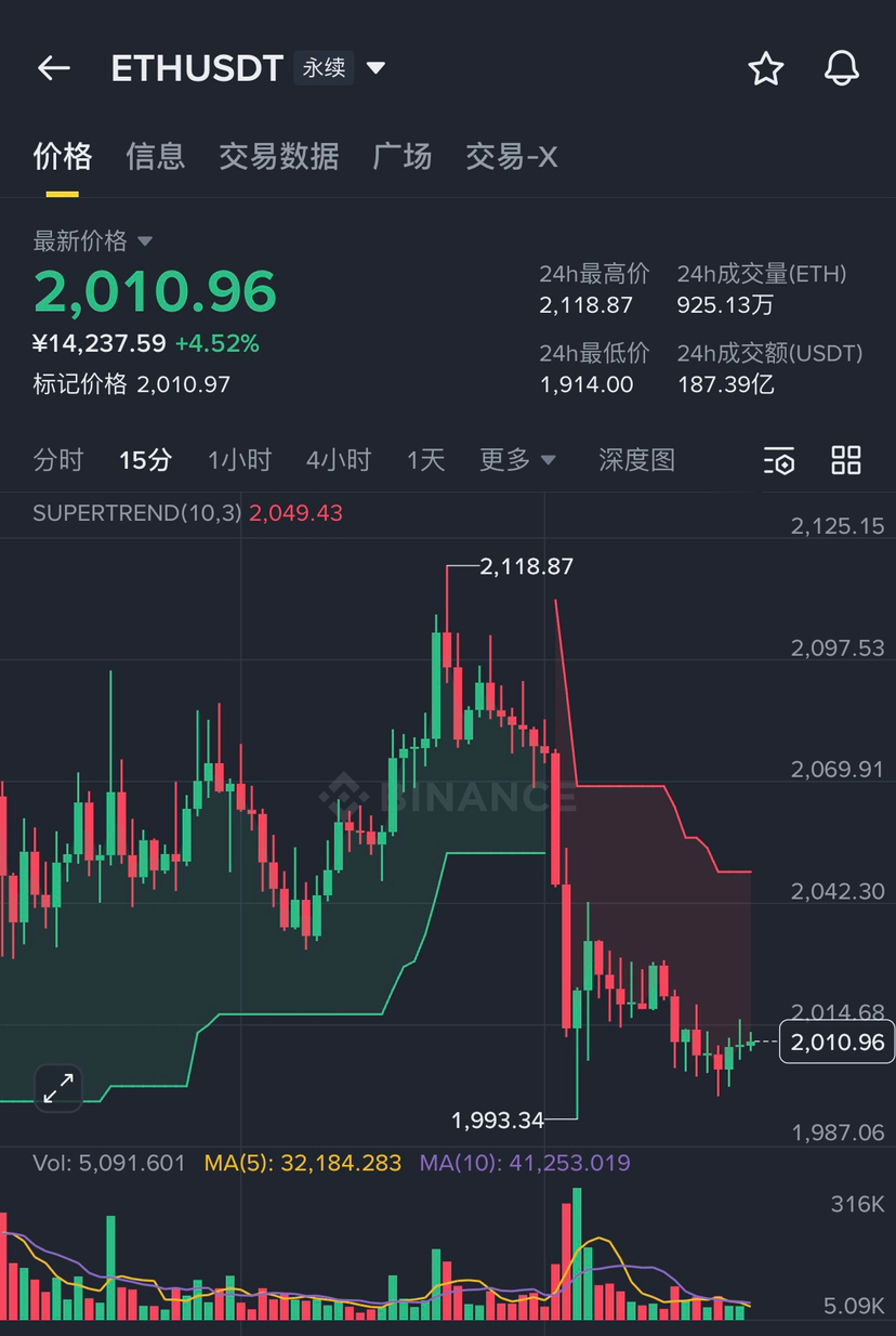 * ETH 特别关注: 设个 1,990 的预警。如果 15 分钟线收盘价跌破这个位置,不要犹豫,直接追空,下方是真空地带,肉很厚。