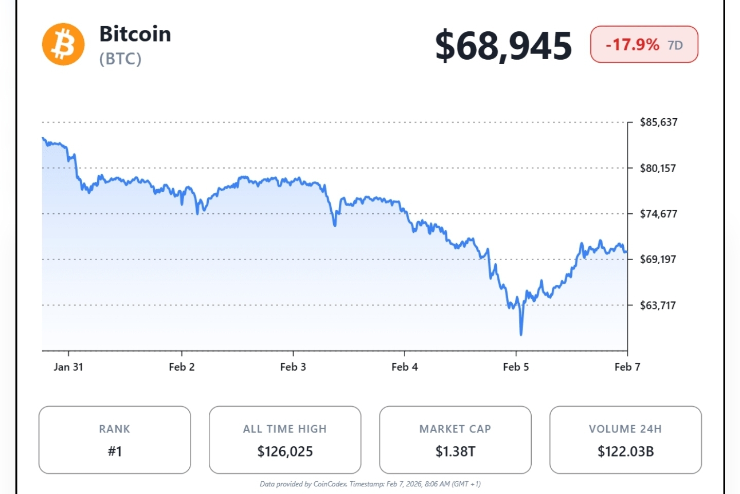Bitcoin đang giao dịch khoảng 68000 đô la vào ngày 7 tháng 2 năm 2026, duy trì một vùng hỗ trợ quan trọng sau khi phục hồi 13 phần trăm từ mức thấp 62700 vào thứ Năm, đây là đợt giảm lớn nhất trong một ngày kể từ khi sụp đổ FTX vào năm 2022