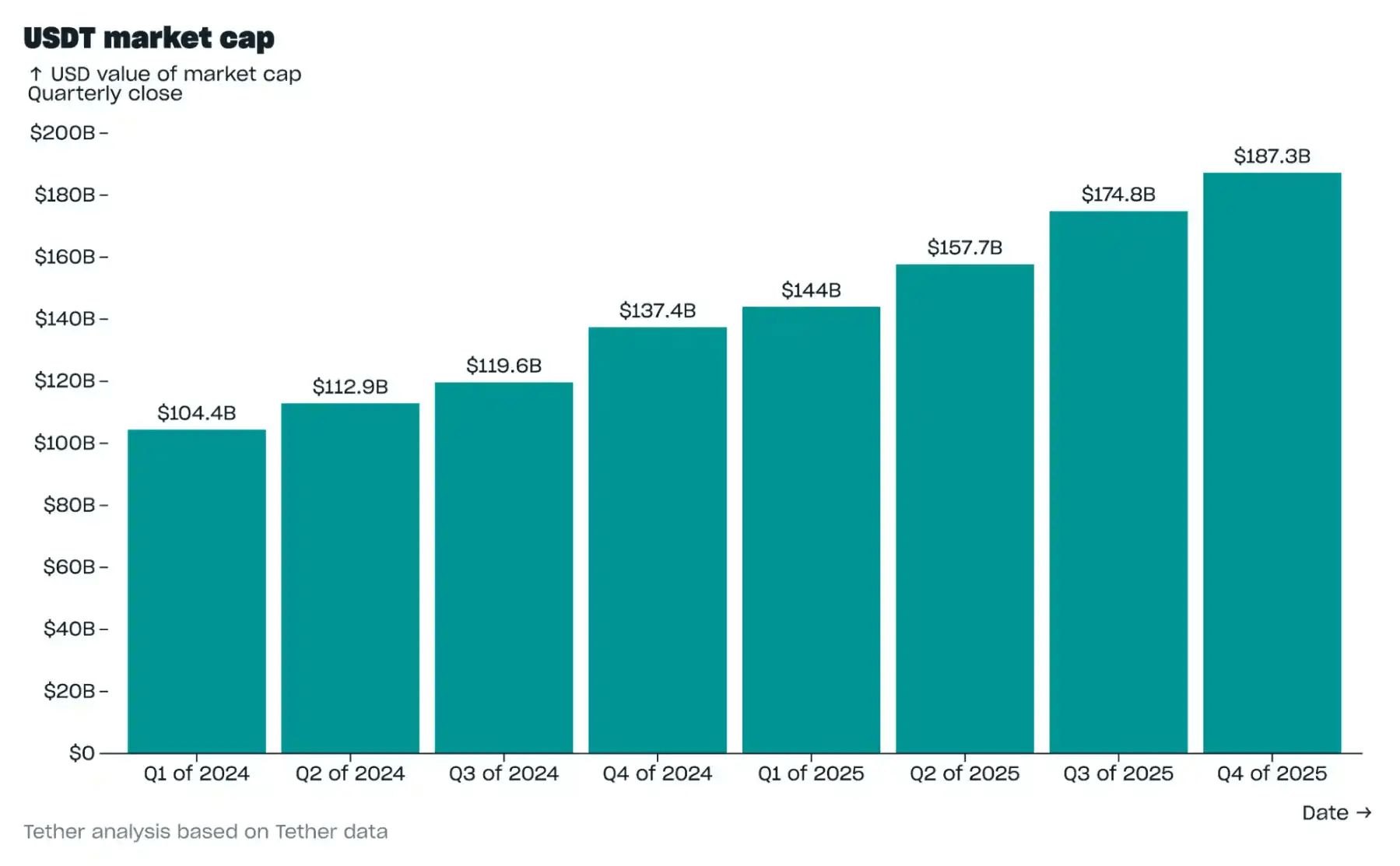 Trong quý IV năm 2025, vốn hóa thị trường của USDT tăng thêm 12,4 tỷ USD, đạt 187,3 tỷ USD. Tỷ lệ tăng trưởng hàng tháng trong tháng 10 là 4,9%, nhưng tốc độ tăng trưởng đã chậm lại sau làn sóng thanh lý tiền điện tử vào ngày 10 tháng 10.