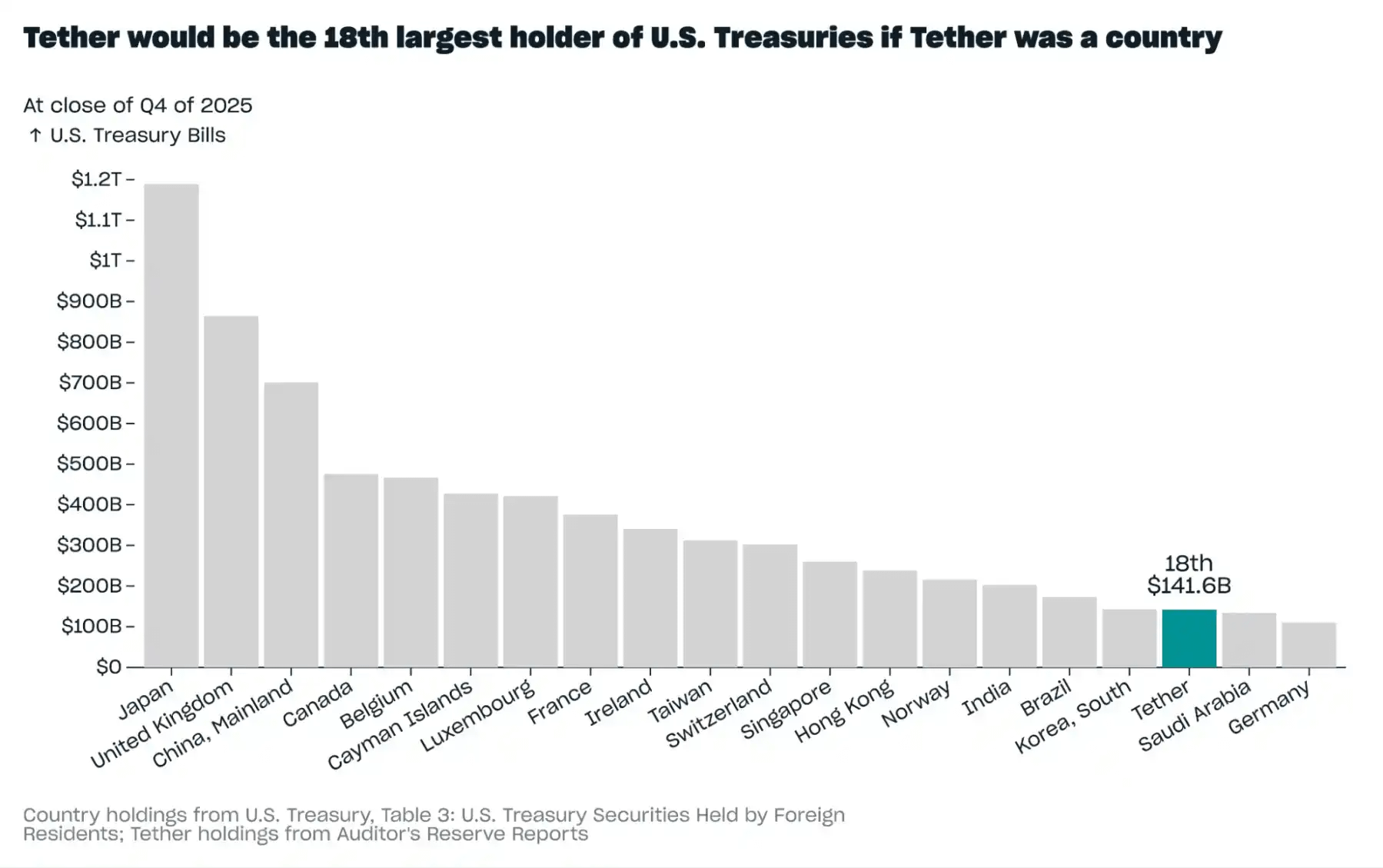 Trong quý IV, tổng lượng trái phiếu kho bạc Mỹ mà Tether nắm giữ đã tăng thêm 6,5 tỷ đô la, đạt 141,6 tỷ đô la. Nếu Tether được coi là một "quốc gia", lượng trái phiếu kho bạc Mỹ mà nó nắm giữ sẽ xếp thứ 18 trên toàn cầu, vượt qua Ả Rập Xê Út và Đức.