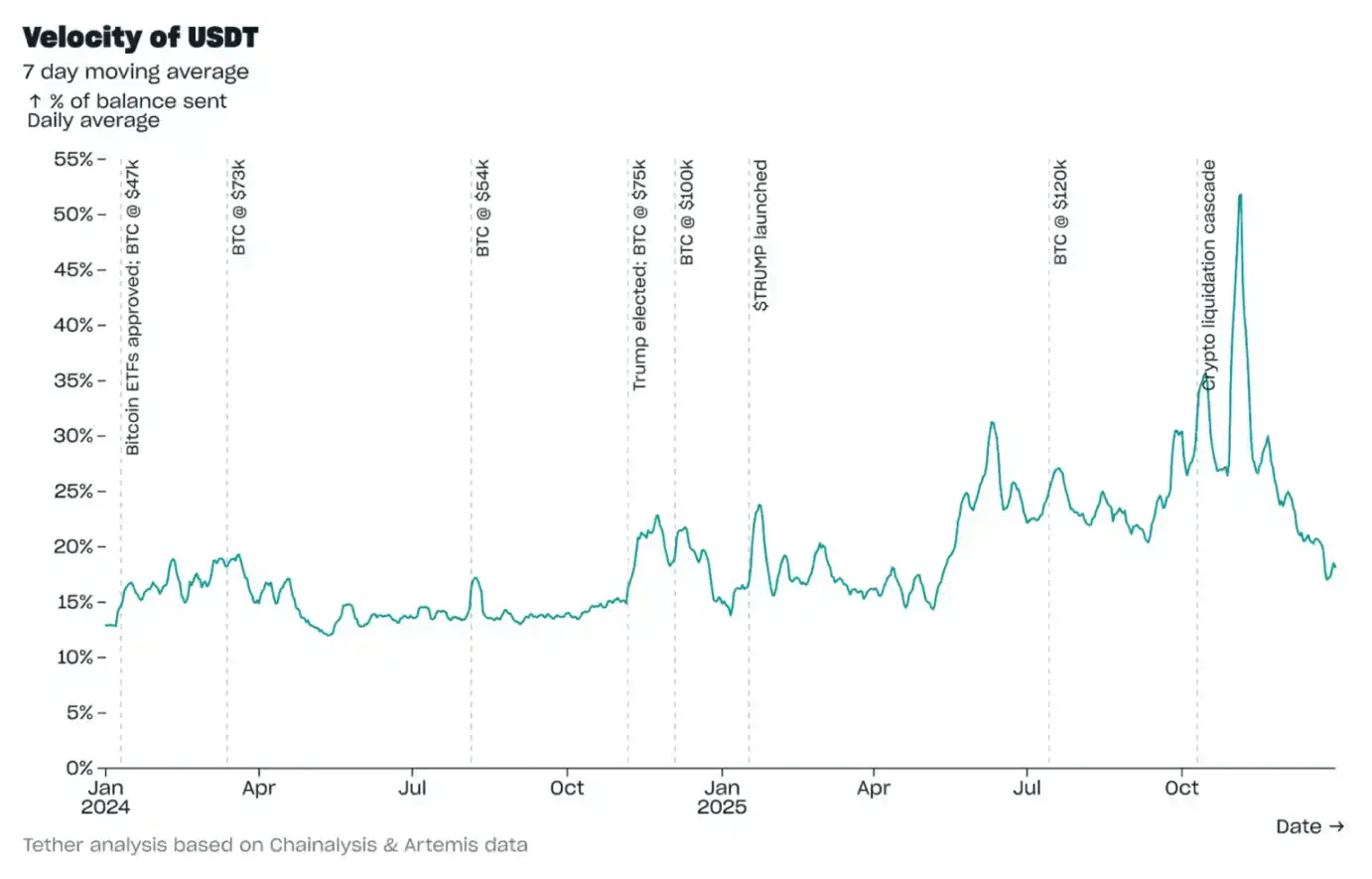 Tính đến cuối quý 4 năm 2025, tốc độ lưu chuyển của USDT (tỷ lệ phần trăm các giao dịch chuyển khoản hàng ngày so với tổng số lượng nắm giữ) là 18,2% dựa trên mức trung bình di động 7 ngày. Con số này thấp hơn mức đỉnh 51,8% vào ngày 5 tháng 11 (do sự bùng nổ hoạt động DeFi) và tương tự như mức được thấy trước quý 2 năm 2025 (khi giá Bitcoin tương tự như giá trong quý hiện tại).