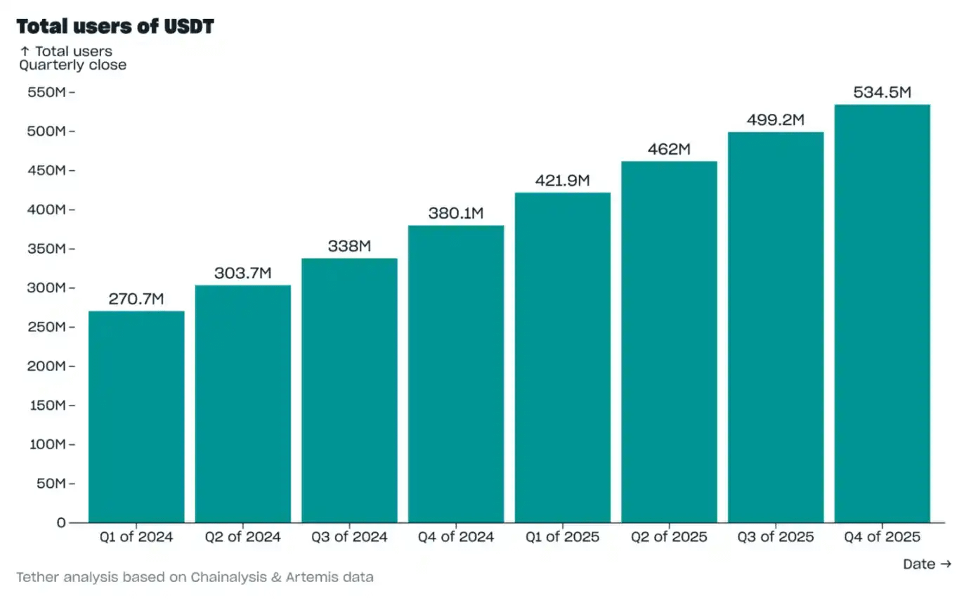 Trong quý IV năm 2025, tổng số người dùng USDT ước tính đã tăng thêm 35,2 triệu người, đạt 534,5 triệu người. Điều này đánh dấu quý thứ tám liên tiếp đồng tiền ổn định này đạt mức tăng trưởng người dùng vượt quá 30 triệu. Số liệu thống kê người dùng ở đây bao gồm hai phần: thứ nhất, người dùng ví trên chuỗi (tức là người dùng đã nhận USDT và nắm giữ ít nhất 24 giờ); và thứ hai, số lượng người dùng ước tính nhận USDT trên các nền tảng dịch vụ tập trung (như các sàn giao dịch tiền điện tử).