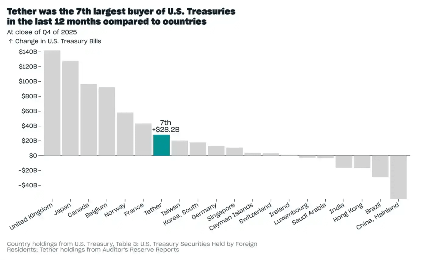 Vào năm 2025, Tether đã tăng lượng trái phiếu kho bạc Mỹ nắm giữ thêm 28,2 tỷ đô la. Trong 12 tháng qua, so với các quốc gia khác, Tether đã trở thành người mua trái phiếu kho bạc Mỹ lớn thứ bảy, vượt qua cả Đài Loan và Hàn Quốc.