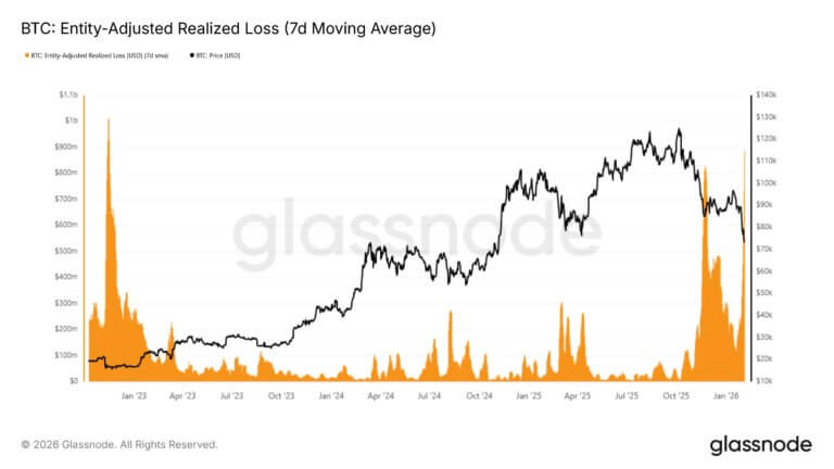 Dữ liệu của Glassnode cho thấy vào ngày 4 tháng 2, tổn thất thực tế điều chỉnh theo thực thể (7D-SMA) của Bitcoin đạt 889 triệu đô la mỗi ngày, mức tổn thất thực tế hàng ngày cao nhất kể từ tháng 11 năm 2022.
