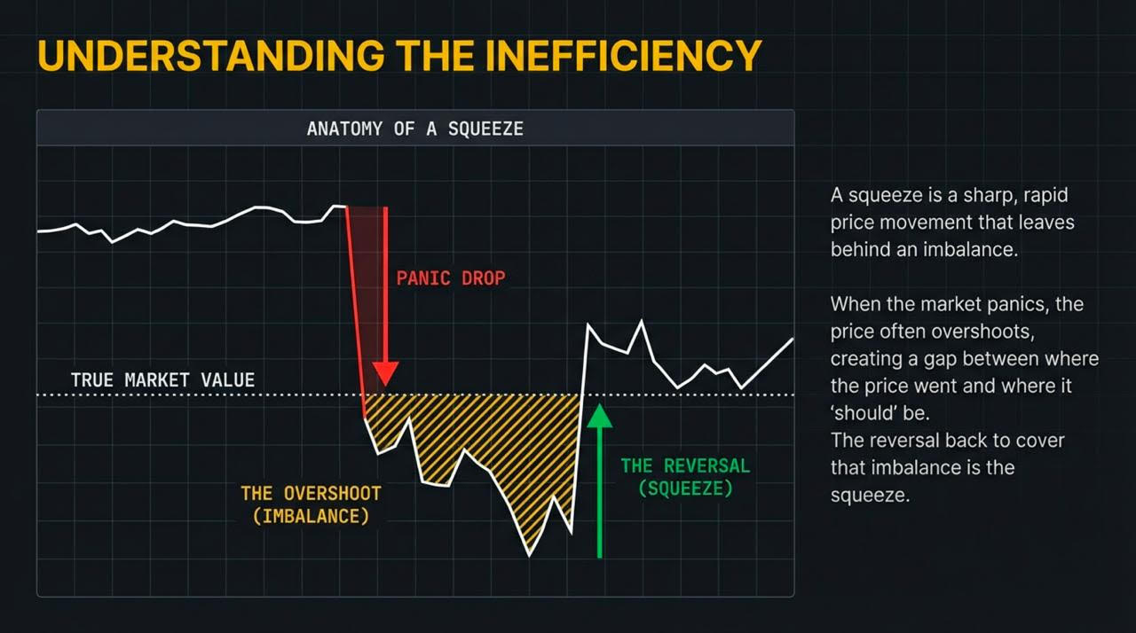 Một chuyển động giá mạnh, nhanh chóng để lại một sự mất cân bằng. Khi thị trường hoảng loạn và giá giảm nhanh, nó thường vượt quá - tạo ra một khoảng cách giữa nơi giá đã đi và nơi nó "nên" ở. Sự đảo ngược trở lại để bù đắp cho sự mất cân bằng đó chính là squeeze.