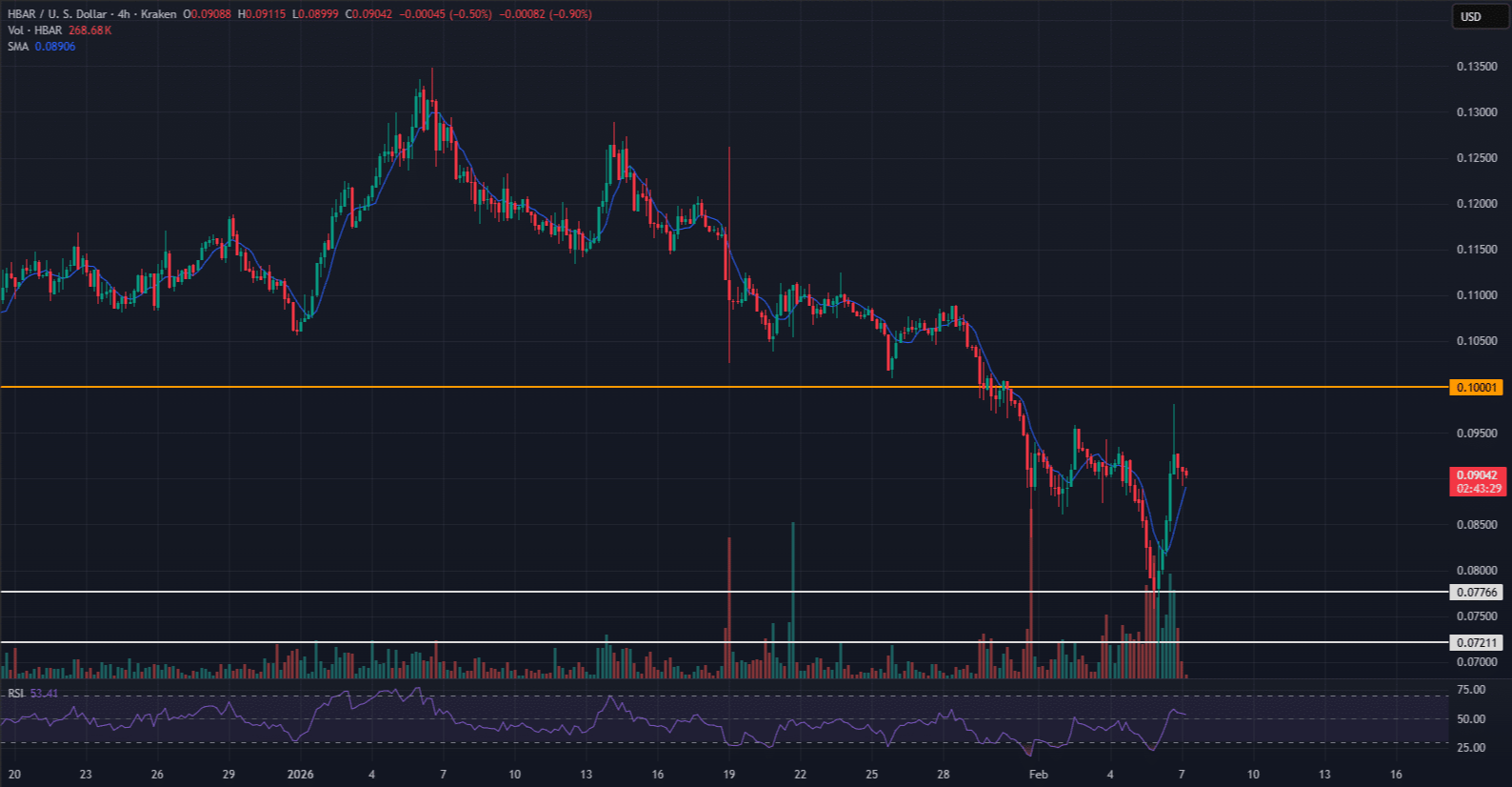 Đà giảm từ $0.134 của HBAR đã kết thúc bằng một râu nến đầu hàng dữ dội tại $0.07766. Khối lượng giao dịch tăng vọt báo hiệu sự kiệt sức trong hoảng loạn phe bán đã xả hết, và phe mua bắt đầu nhập cuộc.