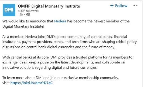 Đầu tháng 2/2026, Hedera đã gia nhập Viện Tiền tệ Kỹ thuật số (OMFIF).