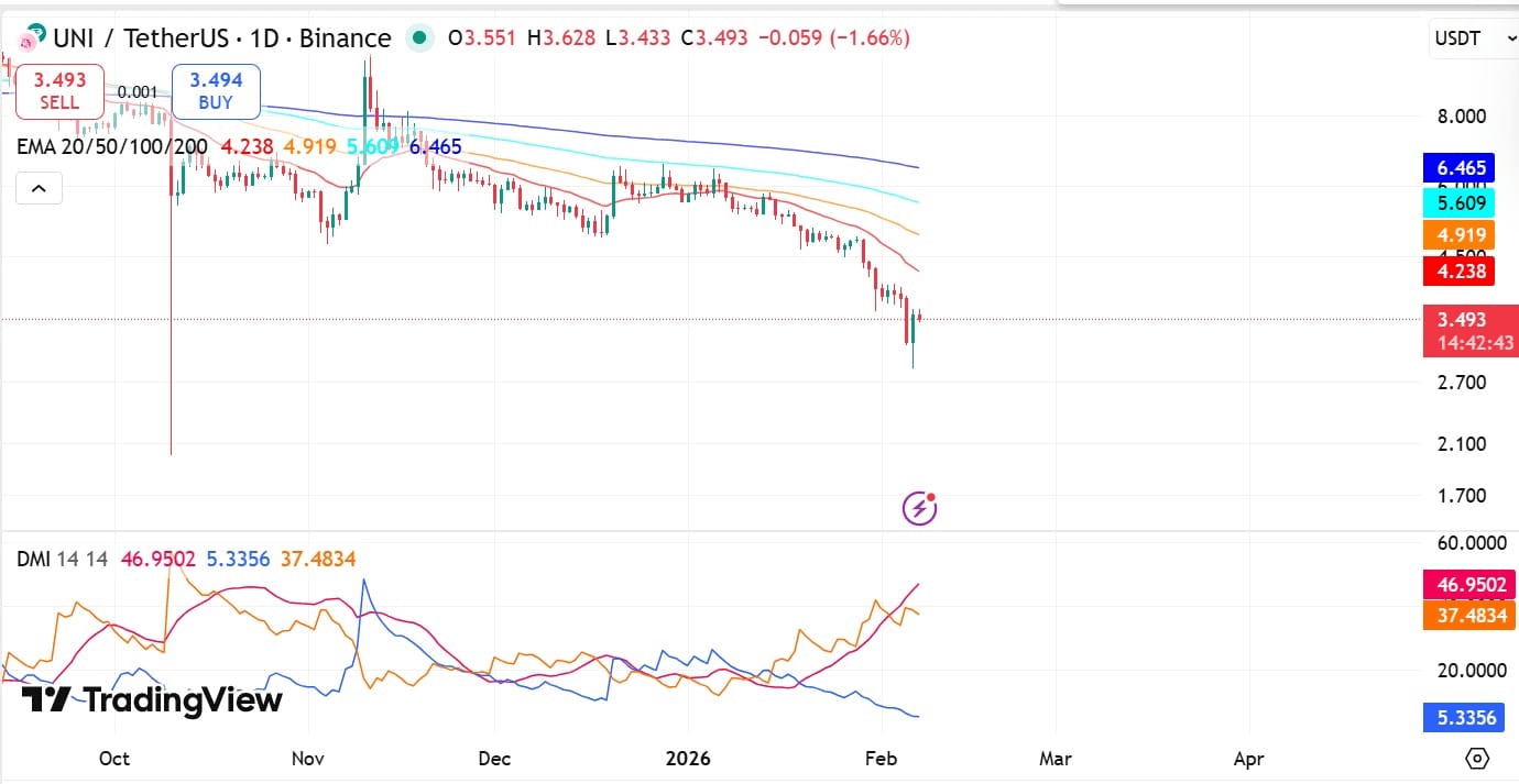 $UNI đã tổ chức phòng thủ quyết liệt, bật tăng từ mức đáy 4 tháng $2.80 lên mức cao cục bộ $3.50. Mặc dù mức tăng 9.2% trong ngày mang lại sự giải tỏa, cấu trúc giá vẫn còn mong manh và một trận chiến lớn tại EMA $4.20 đang chờ phía trước.