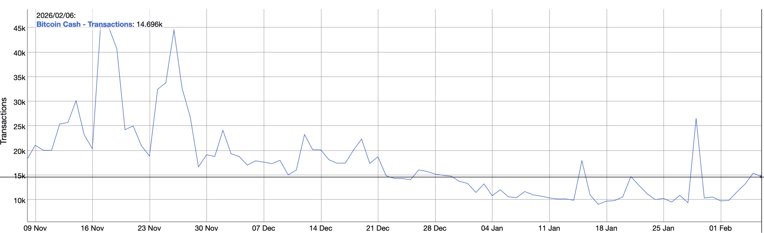 Hoạt động giao dịch tăng vọt từ 9,769 lên 14,240 (1-17/2). Giá trị giao dịch trung bình đạt $8,411, cho thấy sự tham gia của cá voi.