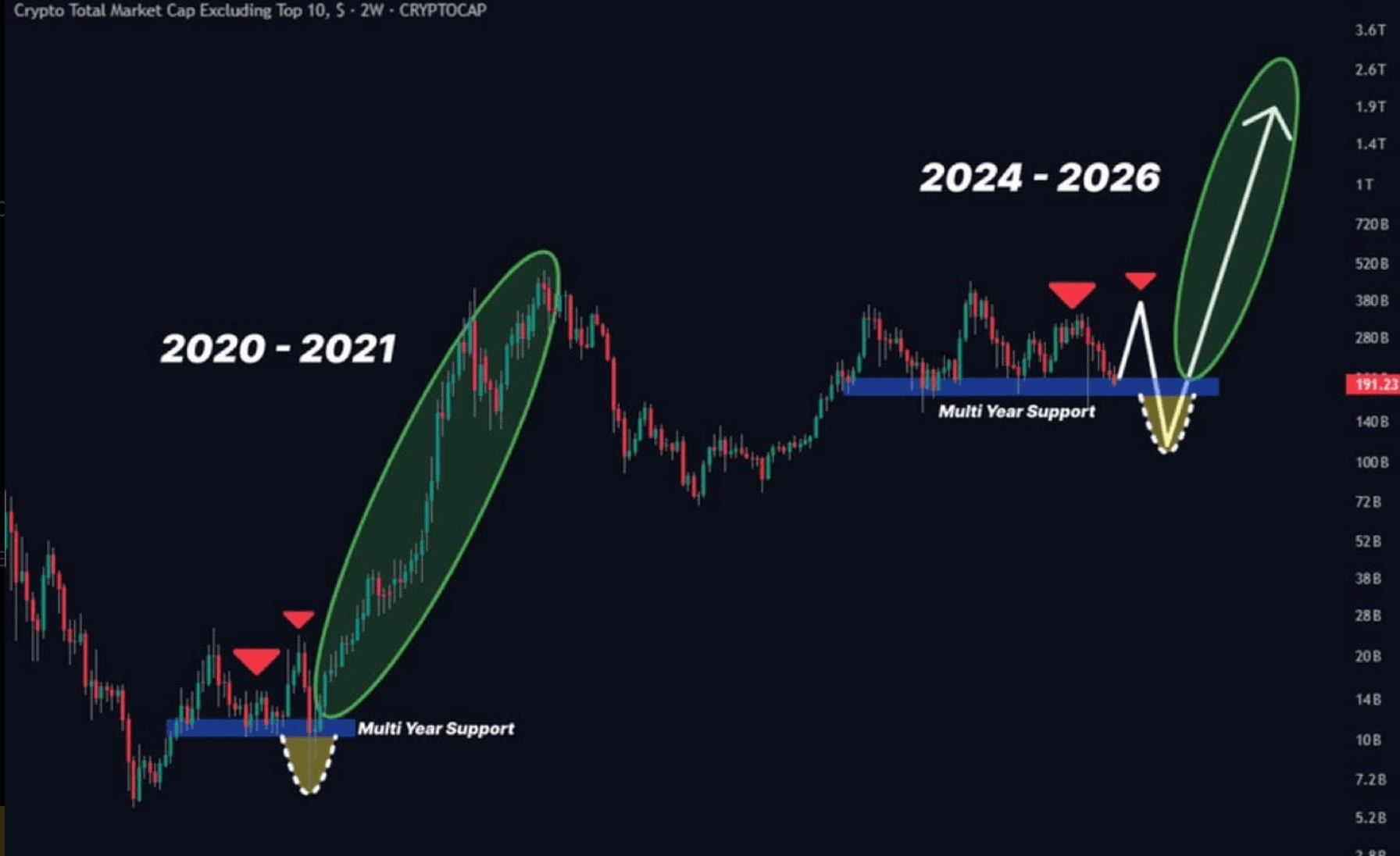 Kể từ năm 2021, mọi nỗ lực phục hồi trước đó đều thất bại và hình thành các đỉnh thấp dần, củng cố vị thế thống trị gần như không thể lay chuyển của Bitcoin. Tuy nhiên, ở thời điểm hiện tại, cấu trúc đó dường như đang có dấu hiệu bị phá vỡ.