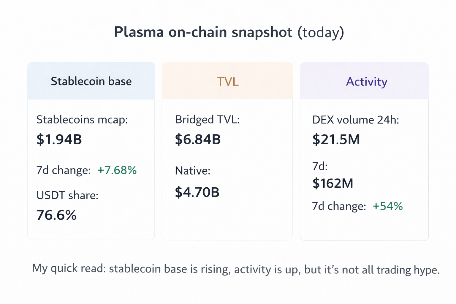 Plasma’s stablecoin market cap is about $1.94B, up about 7.68% over 7 days, and USDT share is roughly 76.6%. TVL is listed around $6.84B bridged, with $4.70B native. Activity-wise, DEX volume is around $21.5M (24h) and $162M (7d), with the weekly number up about 54%.