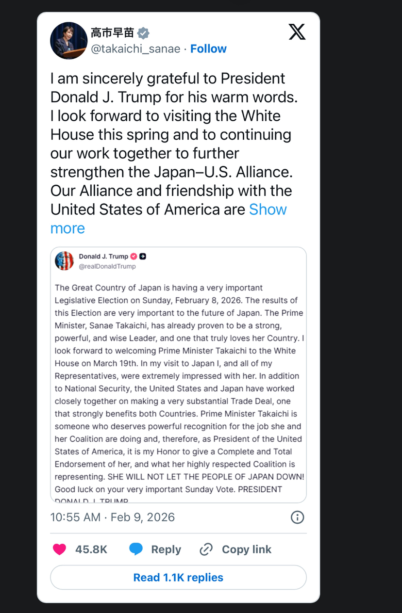 Chỉ số Nikkei 225 của Nhật Bản tăng hơn 5% vào thứ Hai sau khi Thủ Tướng Sanae Takaichi của Đảng Dân Chủ Tự Do (LDP) giành được siêu đa số hai phần ba trong một cuộc bầu cử bất ngờ. Đây là lần đầu tiên kể từ Thế Chiến II một đảng chính trị Nhật Bản giành được hơn hai phần ba số ghế, theo NYT.