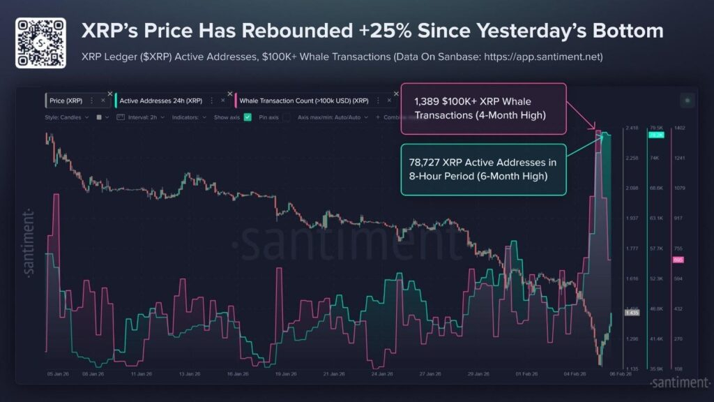 Công ty phân tích chuỗi phổ biến Santiment đã nêu bật một sự gia tăng đáng chú ý trong hoạt động trên chuỗi trong thời gian phục hồi. Theo dữ liệu của họ, XRP Ledger đã ghi nhận 1.389 giao dịch cá voi trị giá 100.000 đô la trở lên, đánh dấu mức độ hoạt động của những người nắm giữ lớn cao nhất trong bốn tháng qua.
