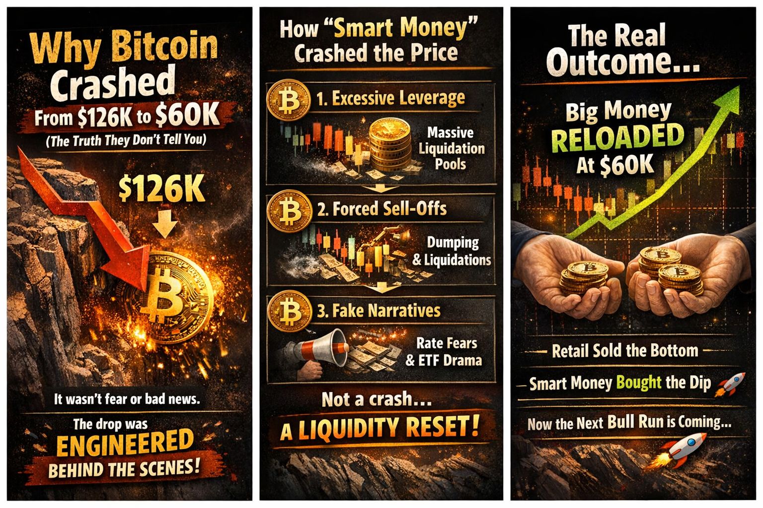 Bitcoin’s drop from $126,000 to $60,000 was a liquidity-driven reset, not a market failure. Large institutions and smart money don’t buy tops — they engineer pullbacks to reload positions.