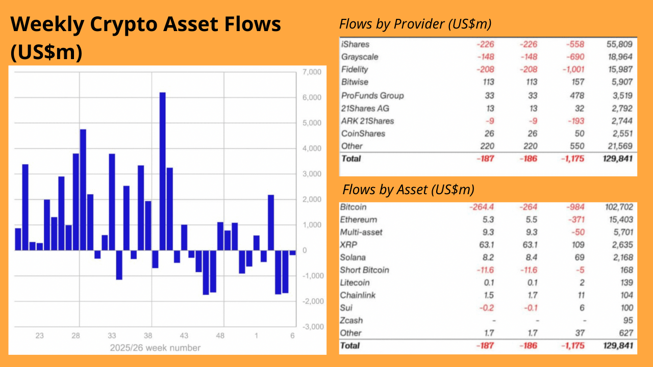 Cập nhật nhanh cho anh em chút về xu hướng dòng tiền tuần qua. Tổng outflow khỏi các quỹ tài sản số chỉ còn 187 triệu USD. Con số này nghe có vẻ lớn nhưng thực ra đã giảm mạnh so với các tuần trước, trong bối cảnh giá vẫn bị bán khá quyết liệt.