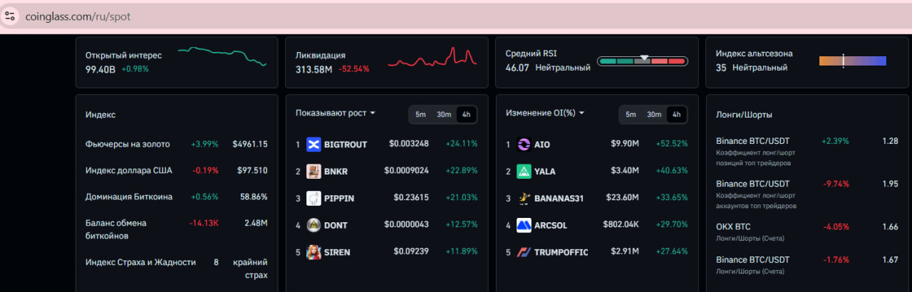 • Sự thống trị BTC: 56.6–58.8% (đang tăng) — altcoin đang chịu áp lực lớn.