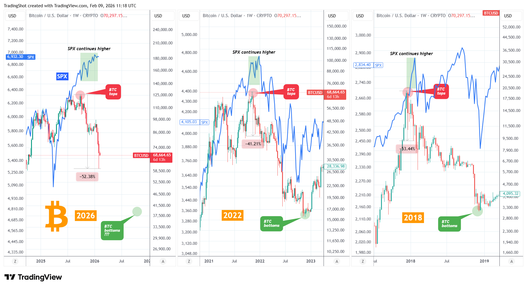 So why this huge divergence between BTC and stocks. Well looking at it historically, this is not uncommon. During the 2022 Bear Cycle, Bitcoin had to crash by more than -40 before the stock market started its own correction, while in 2018 Bitcoin again crashed by more than -50% before the SPX started a Bear Cycle.