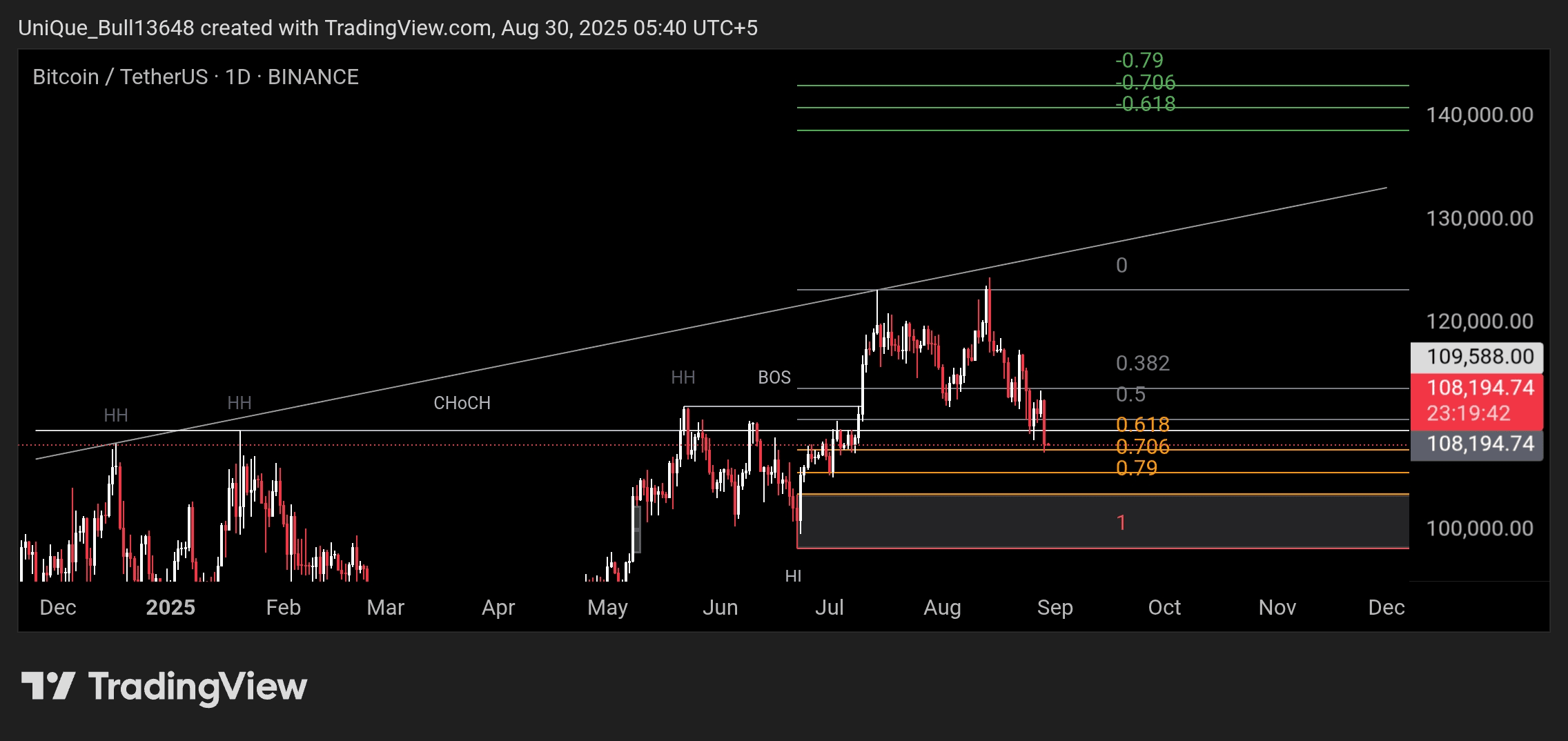 Theo khung thời gian hàng ngày, mức cao gần đây là $124,474, trong khi giá đã giảm xuống $107,463 trước khi đóng cửa cao hơn. Theo vùng vàng của Fibonacci, cơ hội đảo chiều và mua lý tưởng nằm gần $105,300.