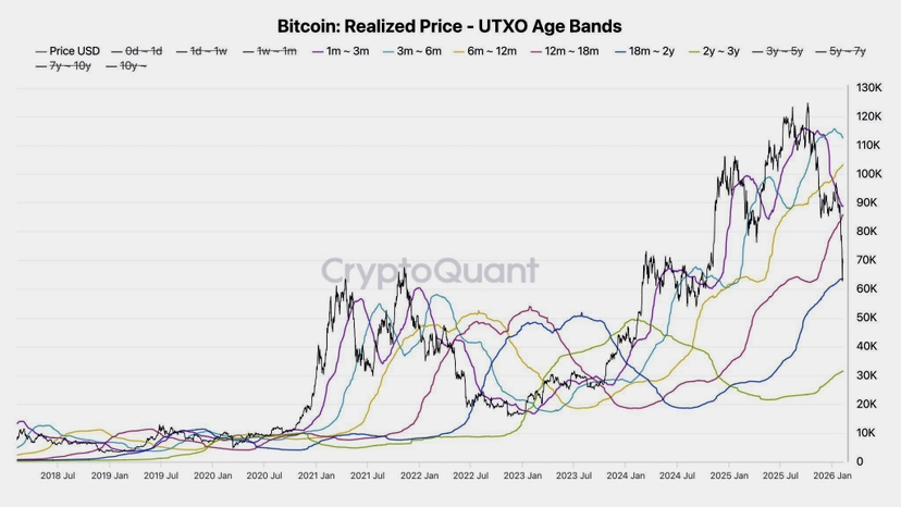 Tiếp theo là áp lực lên những người nắm giữ dài hạn trẻ hơn (6–18 tháng). Cả hai nhóm 6–12M và 12–18M hiện đều dưới mức giá thực hiện của họ, chuyển thị trường từ tích lũy sang giai đoạn kiểm tra áp lực. Nếu nhóm này bắt đầu phân phối một cách quyết liệt, điều đó sẽ báo hiệu thiệt hại sâu hơn ở mức chu kỳ.