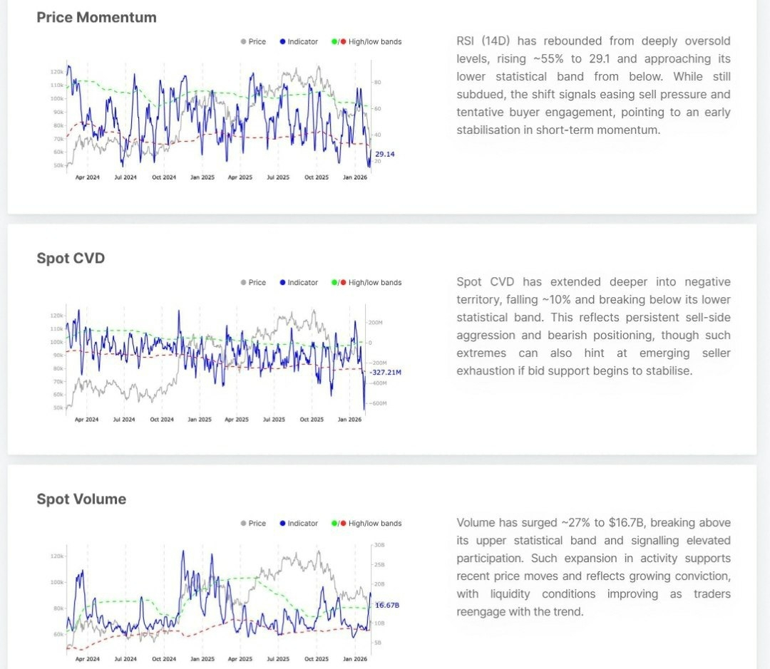 Về kỹ thuật, RSI khung 14 ngày đã bật lên khỏi vùng quá bán sâu, cho thấy áp lực bán có dấu hiệu dịu lại. Nhưng Spot CVD vẫn đang âm khá sâu, tức là bên bán vẫn chủ động xả nhiều hơn bên mua chủ động hấp thụ. Điểm tích cực là volume tăng mạnh, nghĩa là thị trường đang giao dịch sôi động hơn và đây thường là điều kiện cần trước khi có một pha ổn định thật sự.