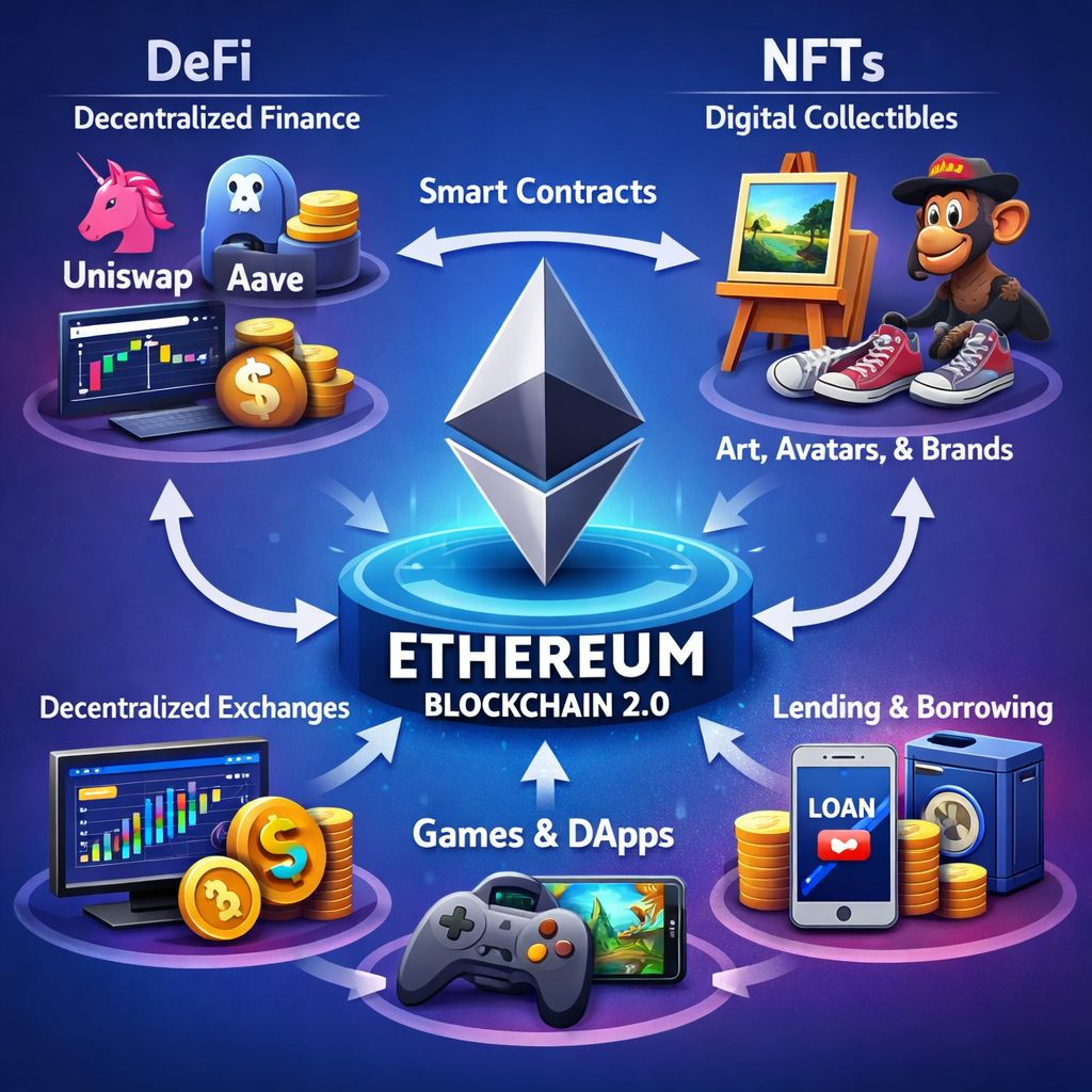 Ethereum thường được gọi là blockchain 2.0 vì nó giới thiệu hợp đồng thông minh, các chương trình tự thực thi chạy tự động trên blockchain. Những hợp đồng này cho phép tài chính phi tập trung, NFT, trò chơi và nhiều ứng dụng khác.