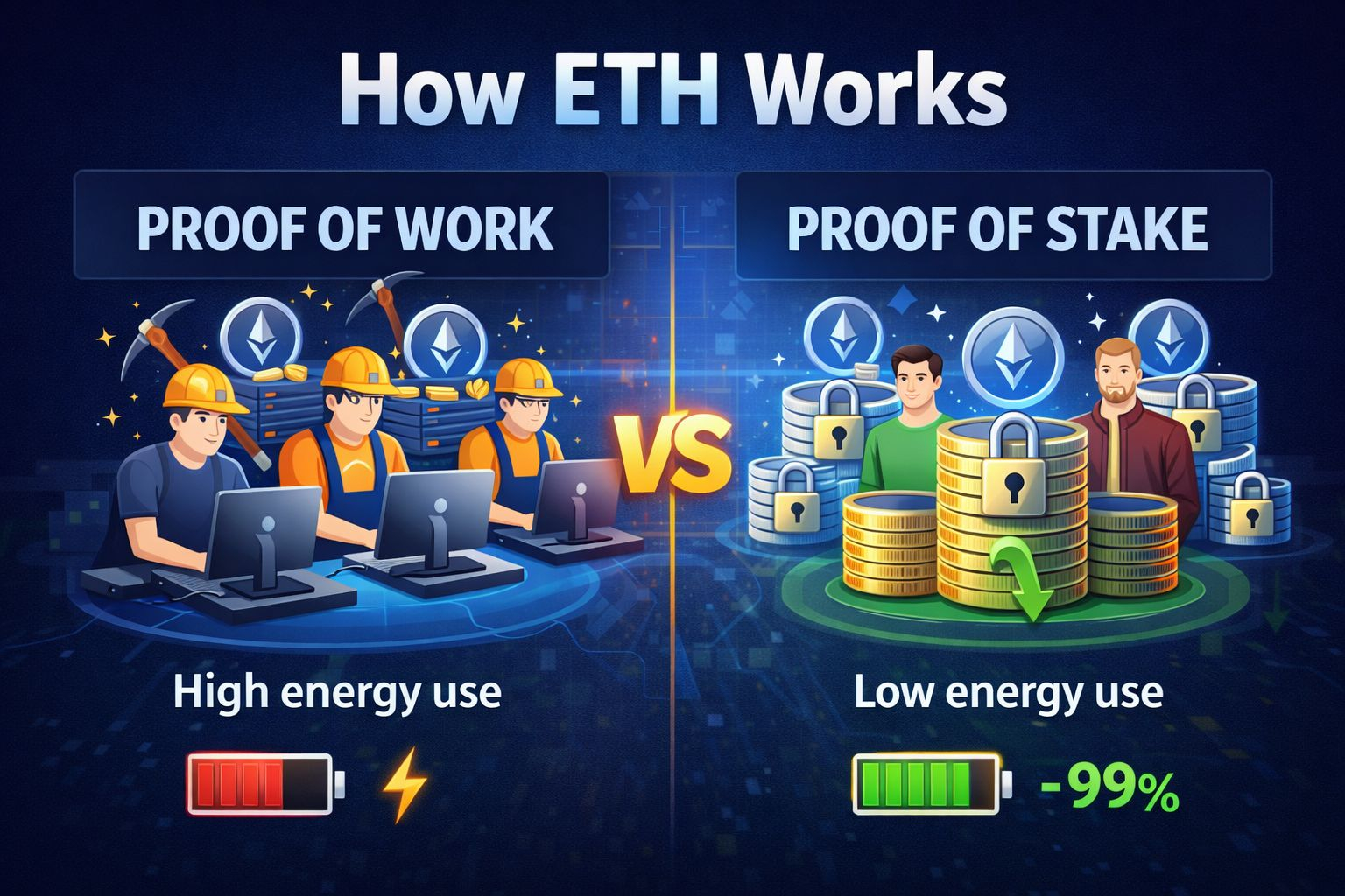 Vào năm 2022, Ethereum đã chuyển sang cơ chế chứng minh cổ phần. Thay vì khai thác, các xác thực bảo mật mạng lưới bằng cách khóa ETH. Nếu họ hành động ác ý, họ sẽ mất tiền. Thay đổi này đã giảm mức tiêu thụ năng lượng hơn 99% và cải thiện khả năng mở rộng lâu dài.