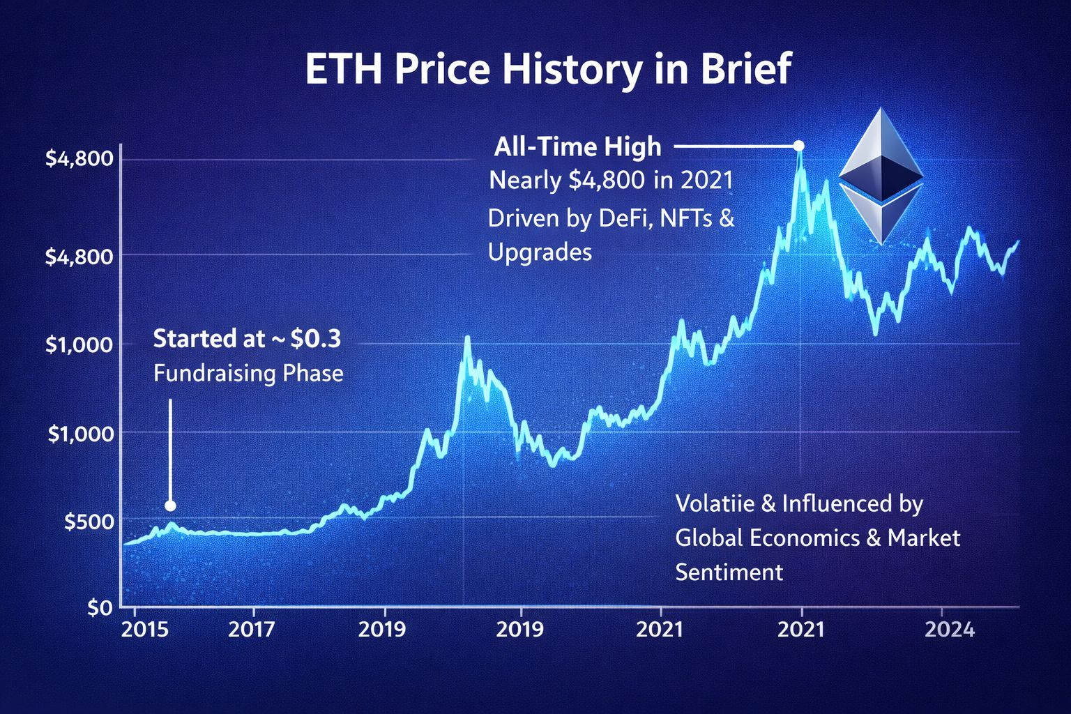 ETH bắt đầu ở mức khoảng 0.3$ trong giai đoạn huy động vốn ban đầu. Qua nhiều năm, nó đã trải qua sự tăng trưởng lớn, sụt giảm mạnh và nhiều chu kỳ thị trường. Nó đã đạt mức cao nhất mọi thời đại gần 4,800 đô la vào năm 2021, được thúc đẩy bởi DeFi, NFT và các nâng cấp mạng.