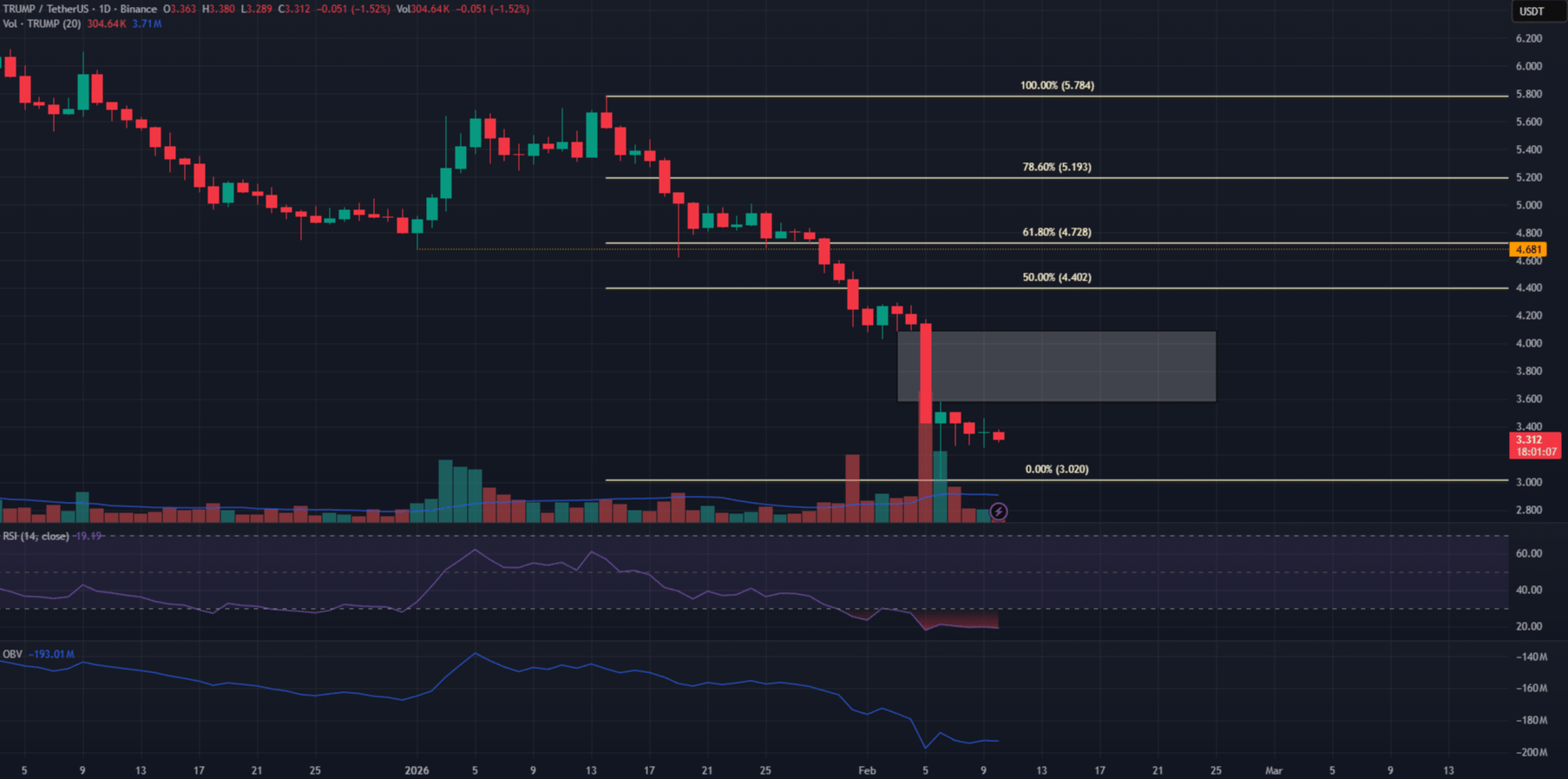 $TRUMP đang rơi tự do. Memecoin hệ Solana này đã xóa sạch gần như toàn bộ lợi nhuận, sụp đổ 95.5% từ đỉnh ATH $73.43 xuống còn $3.32. Với chỉ báo RSI đang gào thét quá bán, liệu một cú bật có sắp xảy ra, hay đây là dấu chấm hết?