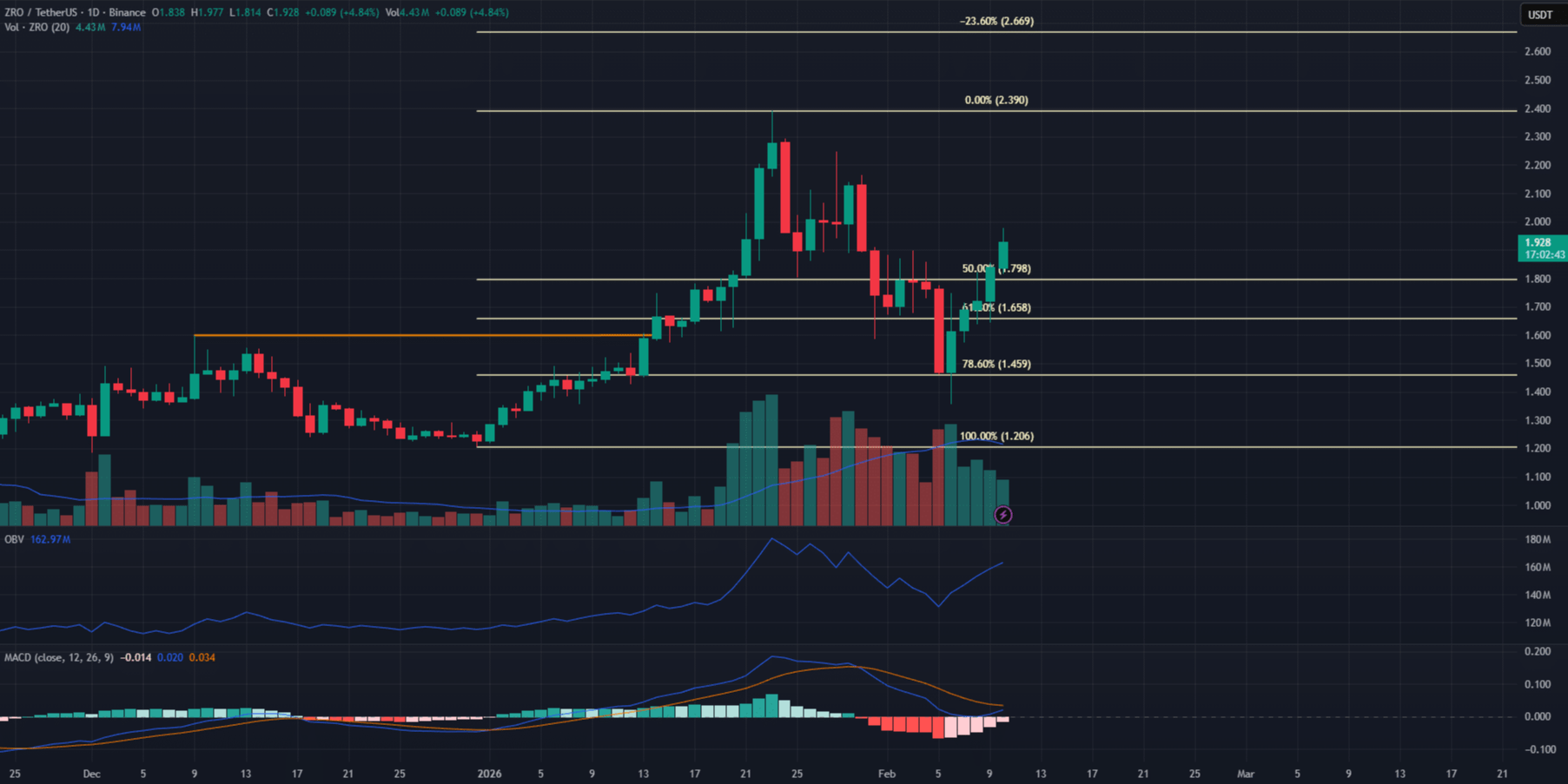 Sau đợt tăng từ $1.20 lên $2.39 vào tháng 1, ZRO đã kiểm định thành công mức Fibonacci 78.6% ($1.459). Phe bò đã bảo vệ mức sàn này một cách thuyết phục.