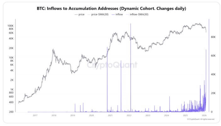 Các địa chỉ tích lũy theo dõi bởi CryptoQuant đã nhận được 66,940 Bitcoin vào ngày 6 tháng 2, một động thái mà nhiều người theo dõi thị trường mô tả là dòng chảy vào lớn nhất trong một ngày của chu kỳ hiện tại.