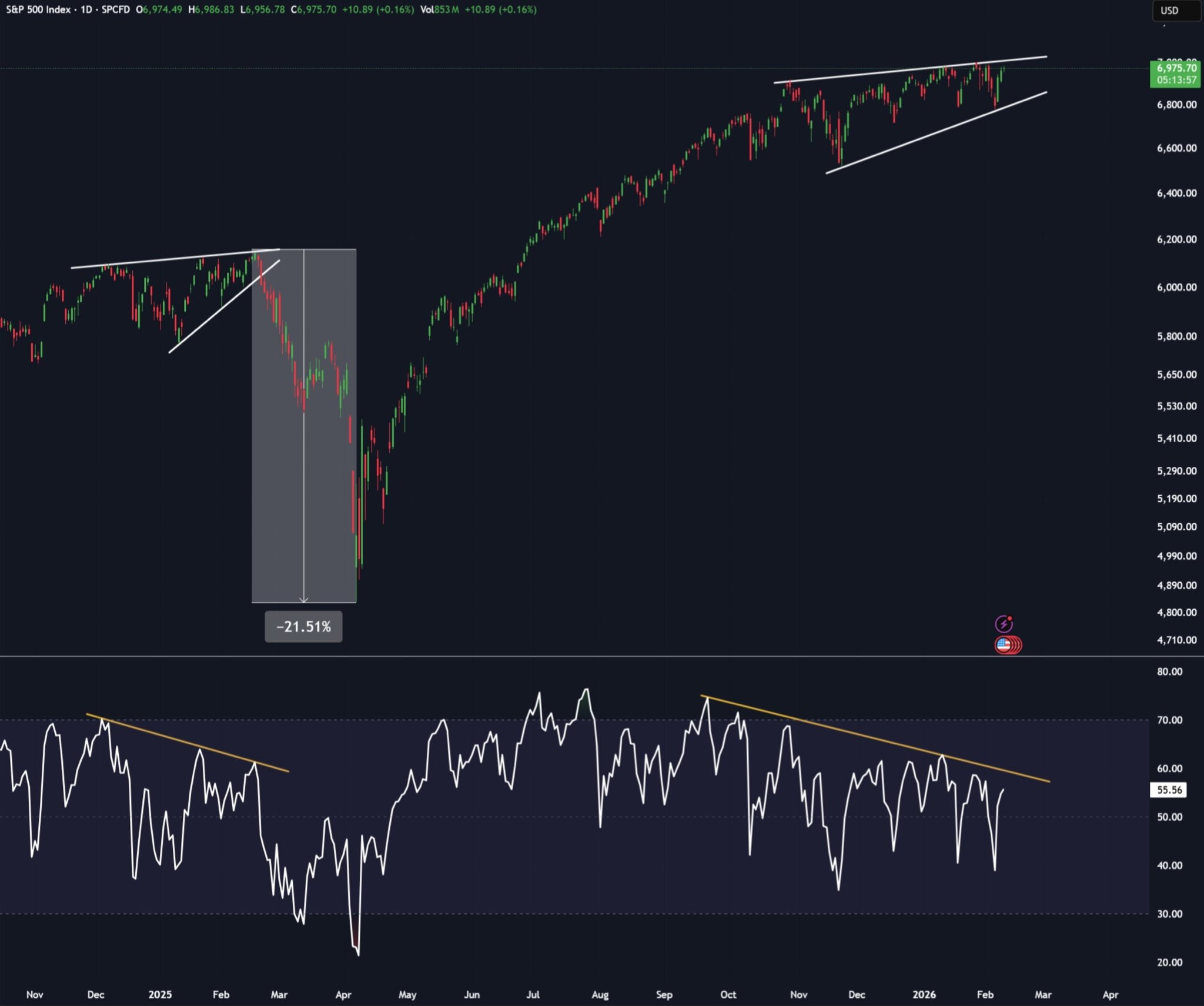 Chỉ số RSI hàng ngày đang cho thấy sự yếu kém ngay cả khi giá đang tăng cao, một cấu trúc rất giống với những gì chúng ta đã thấy trong quý 1 năm 2025 trước một đợt điều chỉnh lớn.
