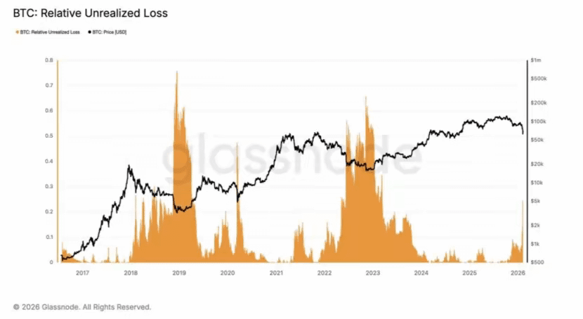 Một trong những chỉ báo on-chain đáng tin cậy nhất để xác định chu kỳ thị trường của Bitcoin là “Relative Unrealized Loss” (Tỷ Lệ Thua Lỗ Chưa Thực Hiện) do Glassnode cung cấp.