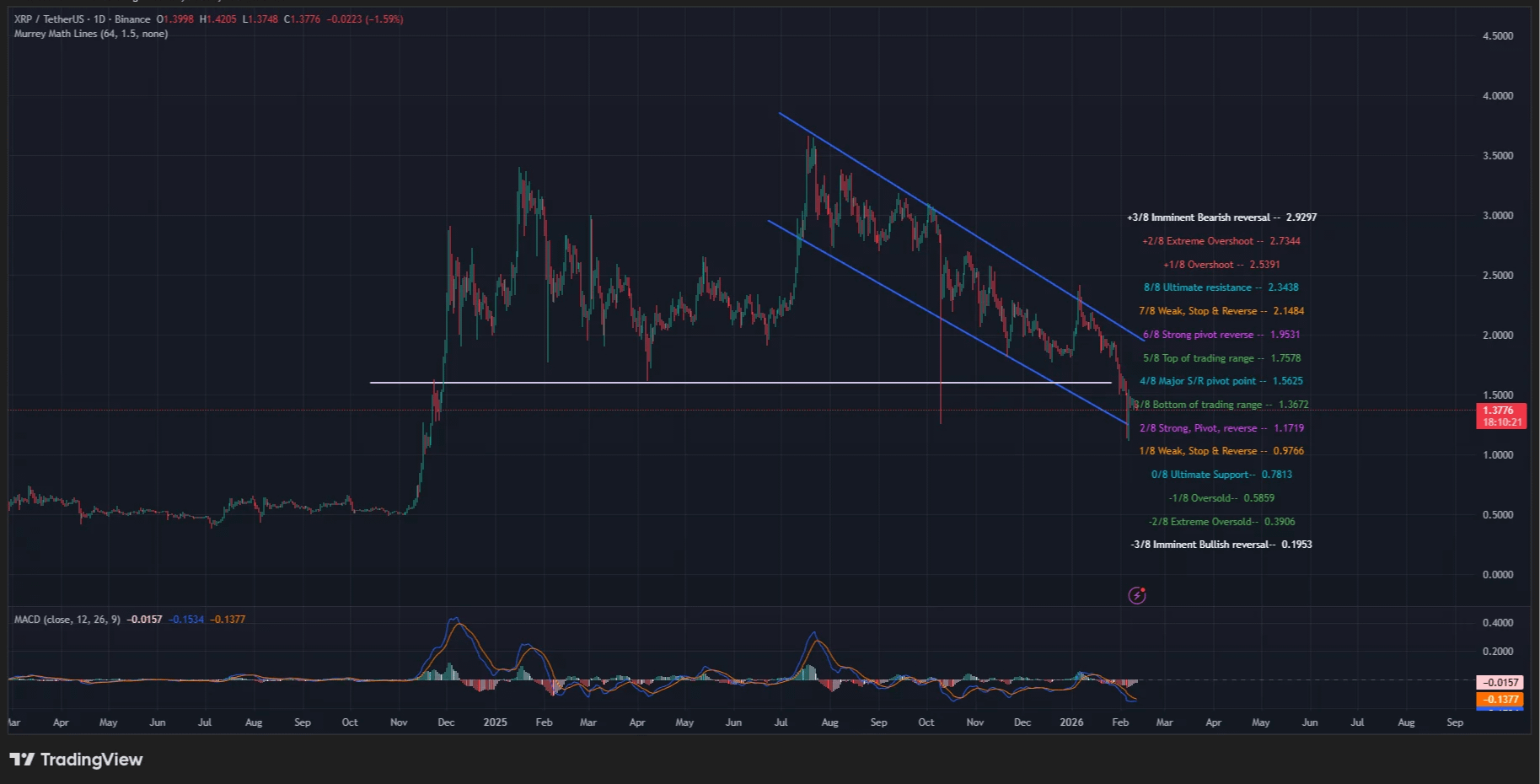 Trên chart ngày, XRP đã gãy mốc hỗ trợ quan trọng $1.56 và đang trượt về vùng $1.17.