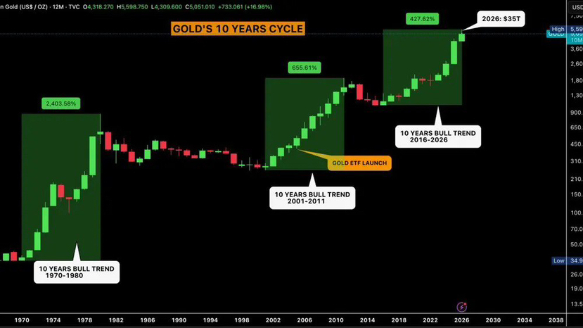 Sự tiến bộ này hiện đang nằm trong cùng một cửa sổ 9–10 năm mà lịch sử đã đánh dấu giai đoạn sau của những đợt tăng mạnh nhất của vàng.